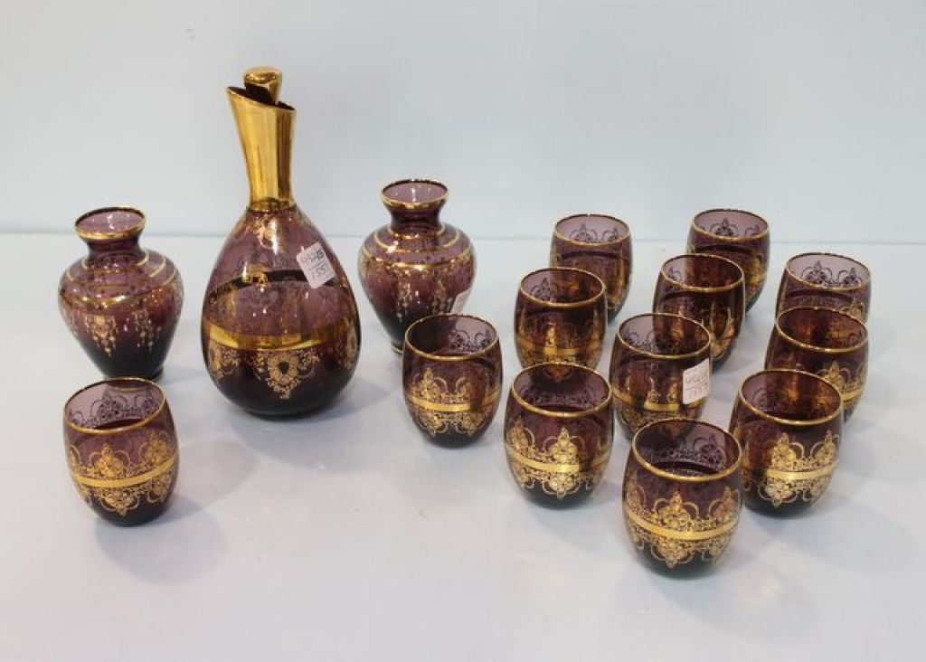 492 Two Amethyst and Gold Vintage Vases & Decanter and Twelve Cups