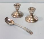 536 Pair Weighted Sterling Silver Candlesticks & Coin Silver Spoon
