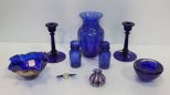Pair of blue 7" h. glass candlesticks, perfume bottle, Thames 6 1/2" dia. blue glass ruffle bowl, Icasda Boda blue glass paperweight, two jars & vase Pair of blue 7" h. glass candlesticks, perfume bottle, Thames 6 1/2" dia. blue glass ruffle bowl, Icasda Boda blue glass paperweight, two jars & vase