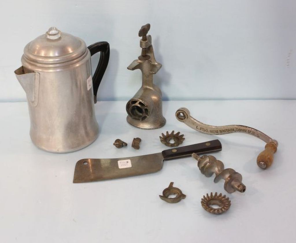 Meat grinder, meat tenderizer & aluminum coffee pot Meat grinder, meat tenderizer & aluminum coffee pot