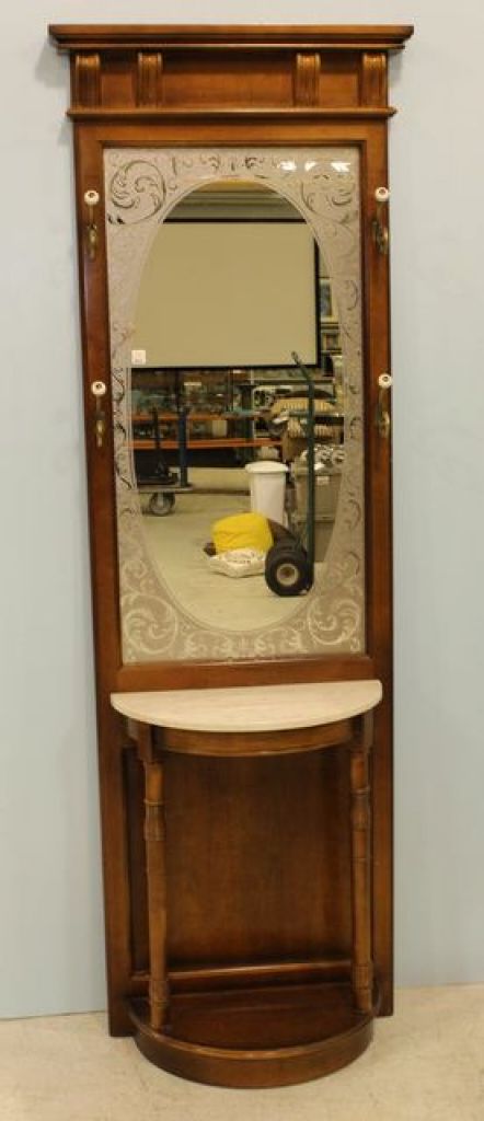 Mirrored, with marble demi lune top; 24" w., 78 1/2" h. Mirrored, with marble demi lune top; 24" w., 78 1/2" h.