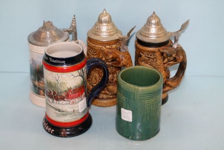 Two German steins, Budweiser stein, Kincade stein & green pottery mug Two German steins, Budweiser stein, Kincade stein & green pottery mug