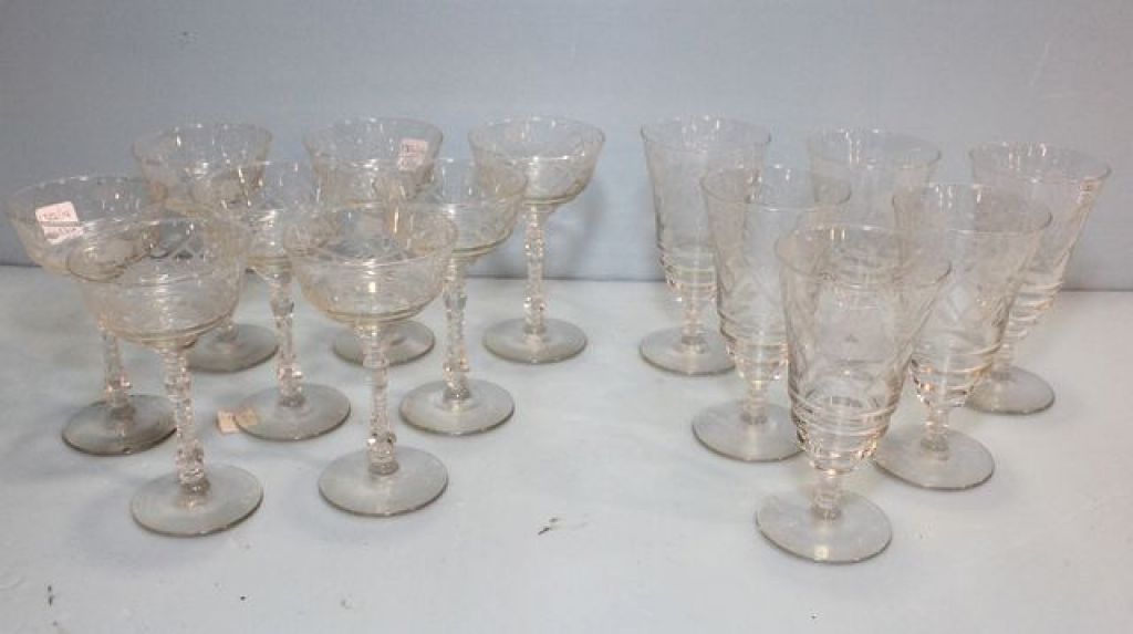 1302 Set of Six Etched Stem Glasses & Set of Eight Etched Champagne Glasses