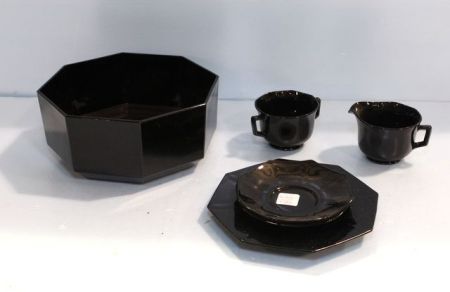 Octagon shaped dish, creamer/sugar, two saucers & black glass salad plate Octagon shaped dish, creamer/sugar, two saucers & black glass salad plate
