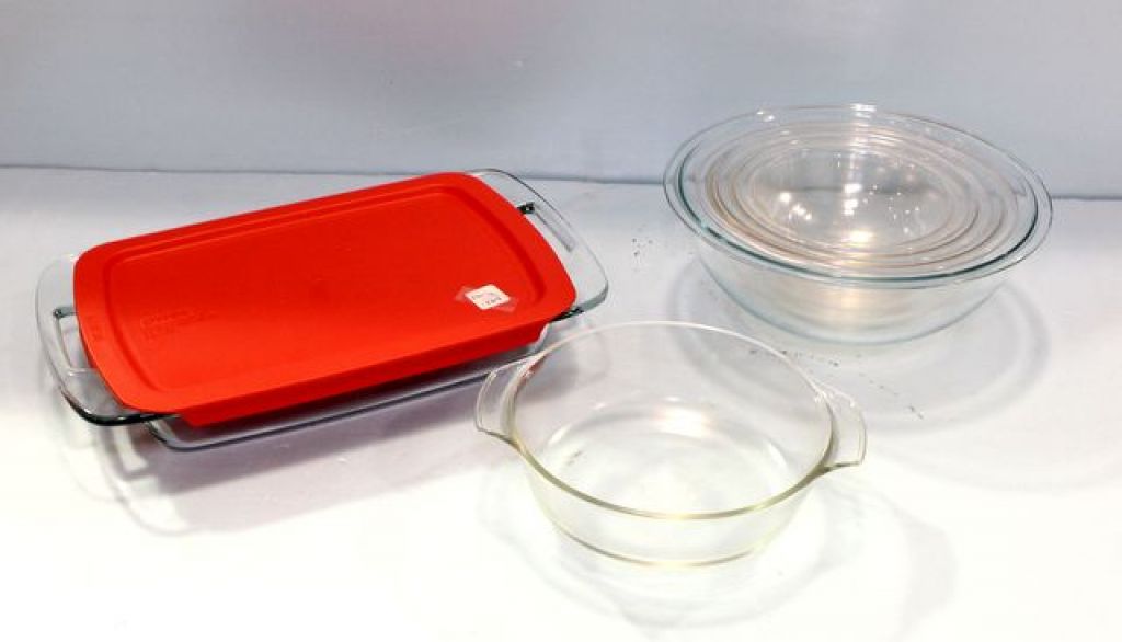 Group of four Pyrex graduated bowls, round Pyrex casserole & rectangular Pyrex dish Group of four Pyrex graduated bowls, round Pyrex casserole & rectangular Pyrex dish