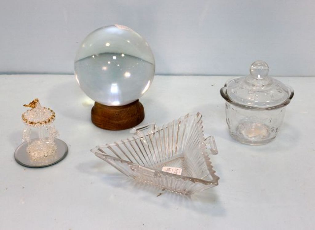 Paperweight on stand, triangle glass dish, small 3" glass carousel & covered glass dish Paperweight on stand, triangle glass dish, small 3" glass carousel & covered glass dish