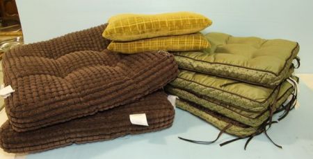 Two large brown velvet cushions or pillows, four green chair cushions & two tufted pillows Two large brown velvet cushions or pillows, four green chair cushions & two tufted pillows