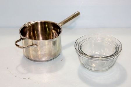 418 Wolfgang Cooking Pot & Three Pyrex Mixing Bowls
