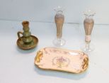 Two 6 1/4" gold etched flower vases, pottery candle holder and small hand painted tray Two 6 1/4" gold etched flower vases, pottery candle holder and small hand painted tray