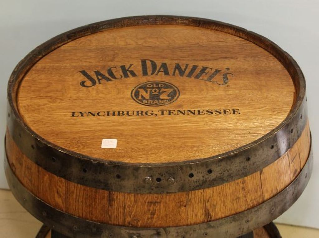 Whiskey barrel made into a side table.; 22" dia., 24" h. Whiskey barrel made into a side table.; 22" dia., 24" h.