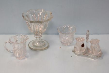 Lead crystal salt and pepper shakers, lead crystal sugar and creamer & clear glass compote Lead crystal salt and pepper shakers, lead crystal sugar and creamer & clear glass compote