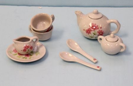 Includes two cups, plate, teapot, sugar, creamer & two spoons Includes two cups, plate, teapot, sugar, creamer & two spoons