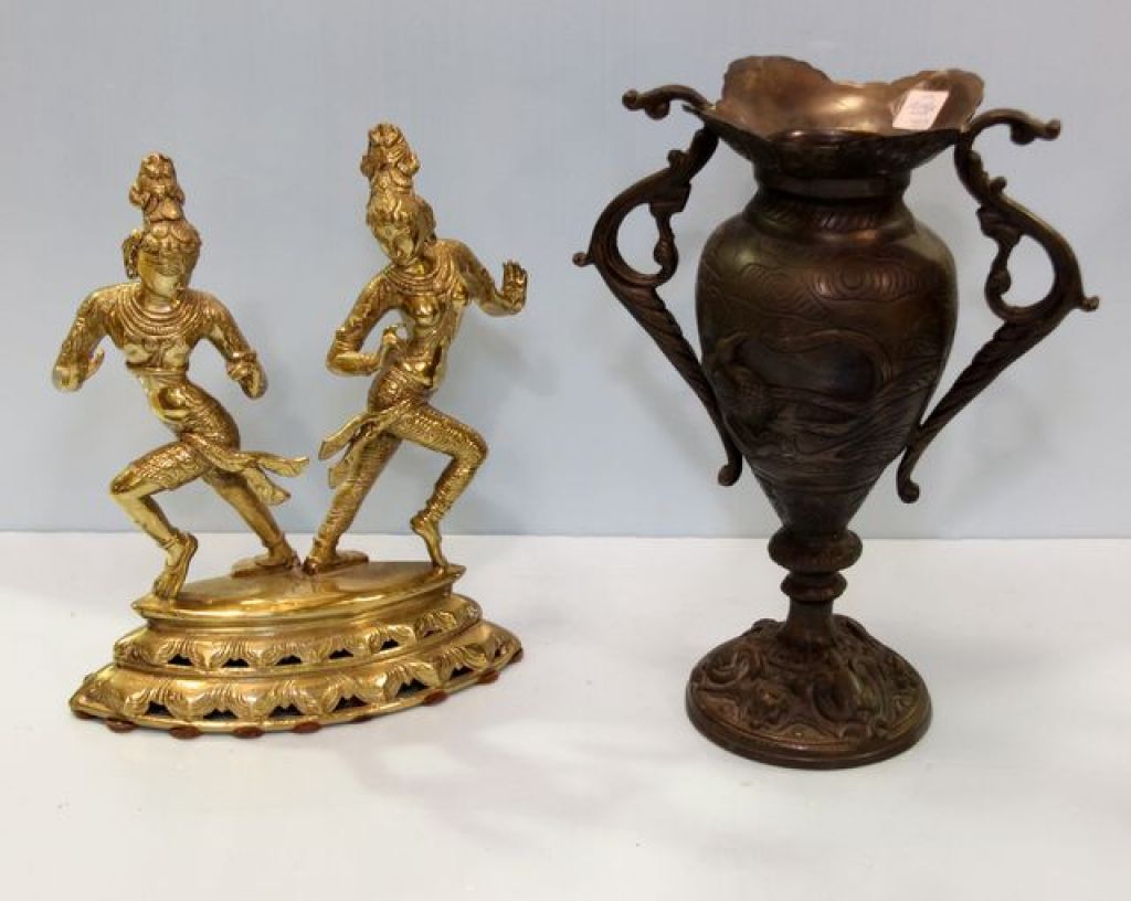 1014 Metal Loving Cup with Bird Motif & Brass Tibetan Sculpture