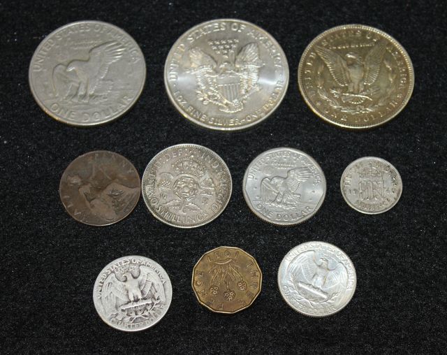 Liberty 10 oz. Fine Silver One Dollar Coin, 1879 Morgan One Dollar Coin, 1971 Eisenhower One Dollar coin, 1979 Susan B. Anthony One Dollar coin, 1942 Quarter Dollar, 1964 Quarter Dollar, 1942 UK Two Shilling Coin Liberty 10 oz. Fine Silver One Dollar Coin, 1879 Morgan One Dollar Coin, 1971 Eisenhower One Dollar coin, 1979 Susan B. Anthony One Dollar coin, 1942 Quarter Dollar, 1964 Quarter Dollar, 1942 UK Two Shilling Coin