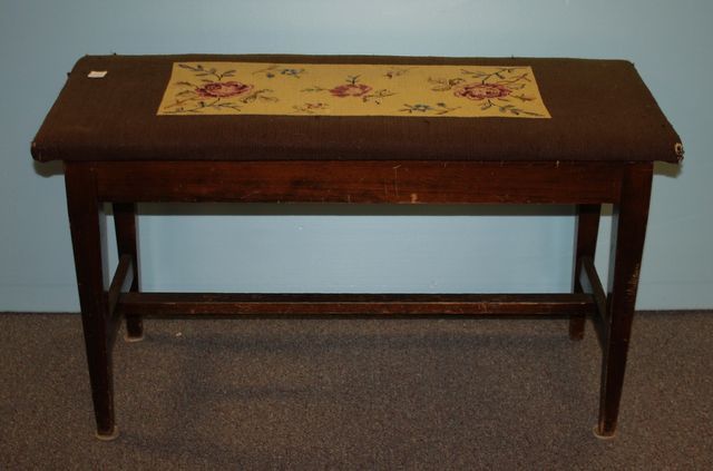 Vintage Piano Bench w/needlepoint; 20"h., 36"w., 16"d. Vintage Piano Bench w/needlepoint; 20"h., 36"w., 16"d.