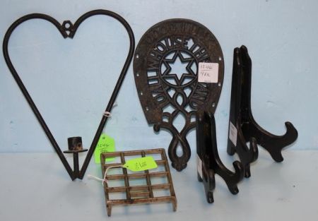 1246 Misc. Lot Two Easels 4"h.; heart-shaped iron candlestick 9"h.; iron trivet 4 1/2"sq.