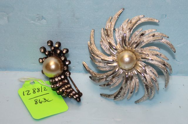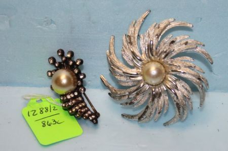 Two Vintage Broaches. One round w/faux pearl in center (Sarah Covingtry), one sterling w/pearl and rhinestones. SC pin is 3"dia., sterling 1 7/8"l. Two Vintage Broaches. One round w/faux pearl in center (Sarah Covingtry), one sterling w/pearl and rhinestones. SC pin is 3"dia., sterling 1 7/8"l.