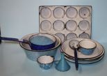 11 Piece Lot of Old Enamel w/chips, muffin pan, pots, pans, dipper, funnel 11 Piece Lot of Old Enamel w/chips, muffin pan, pots, pans, dipper, funnel