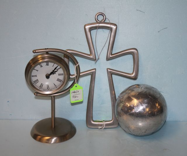 Three Decorative Pieces. Cross 9"x6", ball, clock on stand 7 1/2"h. Three Decorative Pieces. Cross 9"x6", ball, clock on stand 7 1/2"h.