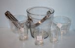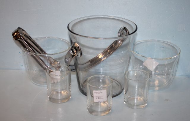 Ice bucket 6"dia., 5 1/2"h.; two bowls 4 1/4"dia.; three glass candle holders 2"dia. Ice bucket 6"dia., 5 1/2"h.; two bowls 4 1/4"dia.; three glass candle holders 2"dia.
