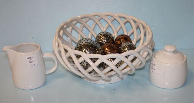 Lindsay Jordan Bread Basket 9 7/8"dia. w/seven decorative balls, home dcor white creamer and sugar 4"h. Lindsay Jordan Bread Basket 9 7/8"dia. w/seven decorative balls, home dcor white creamer and sugar 4"h.