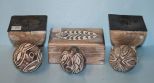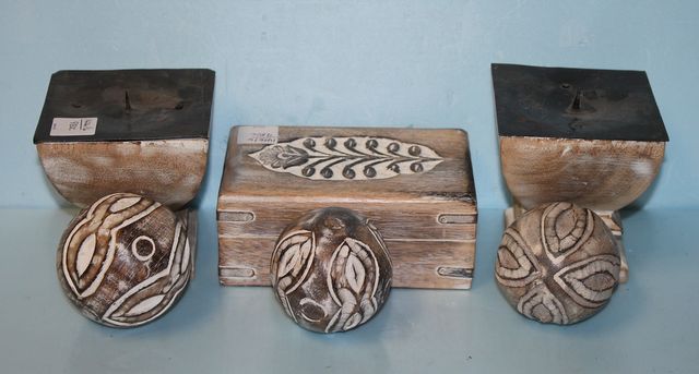 Several Wood Carved, Distressed Pieces. Box 6"x4"x2 1/2"h.; pair candlesticks 4"square, three balls Several Wood Carved, Distressed Pieces. Box 6"x4"x2 1/2"h.; pair candlesticks 4"square, three balls