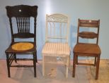 Three Side Chairs; iron, press back, and deco Three Side Chairs; iron, press back, and deco