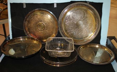 1856 Group of Silverplate Items Five Silverplate Trays (12" - 15" dia.), one bowl (12 1/2" dia.), and one wire basket (8" square)