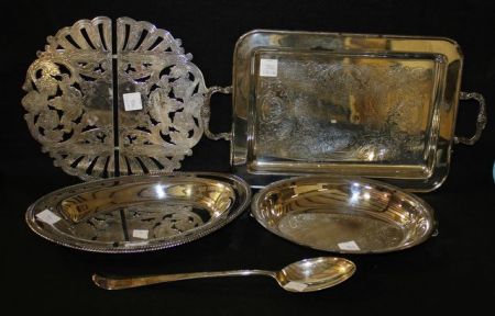 1857 Group of Silverplate Items Silverplate, footed, two handle tray (17"), trivet (10 1/2" dia.), two oval trays, large spoon