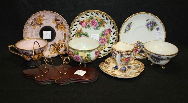 Group of Four Cups and Saucers and Display, one cup chipped Group of Four Cups and Saucers and Display, one cup chipped
