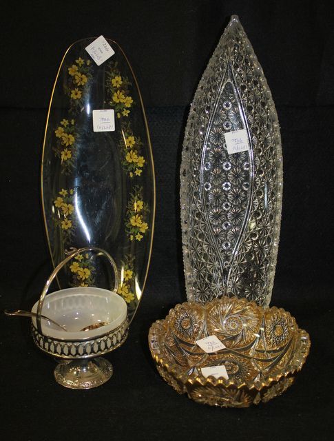 Group of Glass Items, including; glass trays, dish, nut dish with spoon, press glass tray 14 1/2" l. Group of Glass Items, including; glass trays, dish, nut dish with spoon, press glass tray 14 1/2" l.