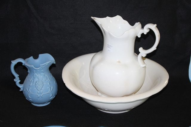 Bowl and Pitcher (12" h. chipped) along with a Blue Pitcher Bowl and Pitcher (12" h. chipped) along with a Blue Pitcher