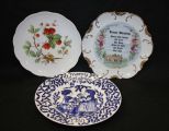 Group of Three Decorative Plates, Blue and White "Merry Christmas" Royal Croconford 8 1/5" dia., Made in Japan "House Blessing" Plate 8" dia., German Hand Painted of strawberries 7 1/2" dia. Group of Three Decorative Plates, Blue and White "Merry Christmas" Royal Croconford 8 1/5" dia., Made in Japan "House Blessing" Plate 8" dia., German Hand Painted of strawberries 7 1/2" dia.