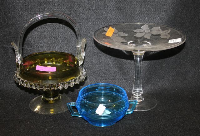 Three Glass Pieces; compote 5 1/2" h., 7 1/2" dia.; blue dish 4" dia., green basket 9 1/2" h. Three Glass Pieces; compote 5 1/2" h., 7 1/2" dia.; blue dish 4" dia., green basket 9 1/2" h.