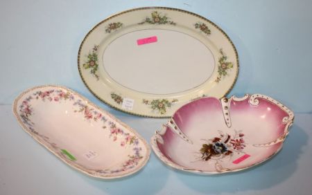 Three Porcelain Pieces; oval hand painted bowl 13 1/4" l., oval hand painted tray 14 1/4", made in Japan platter 14 1/4" Three Porcelain Pieces; oval hand painted bowl 13 1/4" l., oval hand painted tray 14 1/4", made in Japan platter 14 1/4"