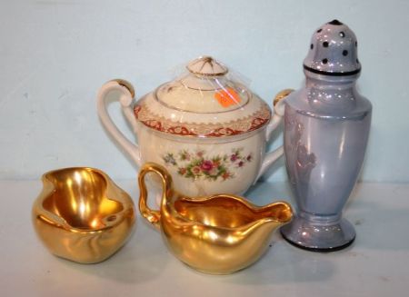 Gold Ceramic Creamer and Sugar (2" h.), Lusterware Shaker (7" h.) and a Lucky China Covered Sugar Gold Ceramic Creamer and Sugar (2" h.), Lusterware Shaker (7" h.) and a Lucky China Covered Sugar