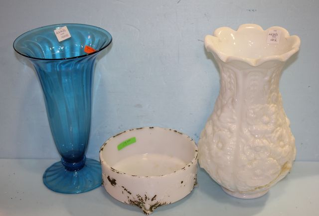 Milk Glass Bowl (7" dia.) and Vase (12" h.) along with Blue Glass Vase (11 1/2" h.) Milk Glass Bowl (7" dia.) and Vase (12" h.) along with Blue Glass Vase (11 1/2" h.)