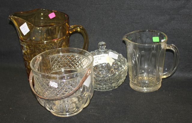 Four Glass Pieces; pitcher 6" h., ice bucket 5 1/2" h., pitcher 8" h., candy dish 5" dia. Four Glass Pieces; pitcher 6" h., ice bucket 5 1/2" h., pitcher 8" h., candy dish 5" dia.