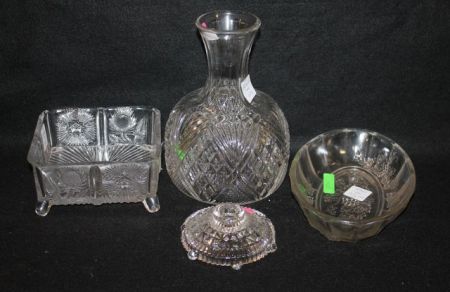 Four Press Glass Pieces; decanter 8 1/2" h., square dish 5 1/2", candlestick, 4" dia. Oval dish Four Press Glass Pieces; decanter 8 1/2" h., square dish 5 1/2", candlestick, 4" dia. Oval dish