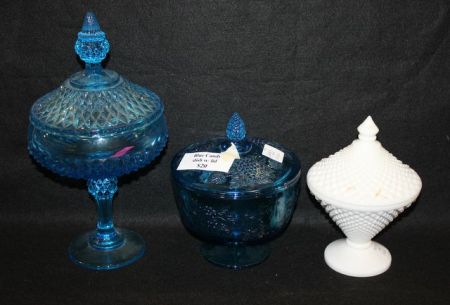 2281 Two Light Blue Covered Candy Dishes along with a Milk Glass Candy Dish