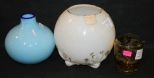 Three Victorian Glass Pieces; amber etched cup 3" h., blue vase 5" h., Bristol bowl 6 1/2" h. Three Victorian Glass Pieces; amber etched cup 3" h., blue vase 5" h., Bristol bowl 6 1/2" h.