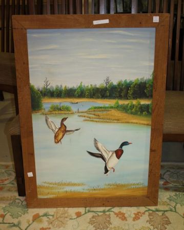 2309 Oil Painting of Flying Ducks, signed WEA in Cypress Frame