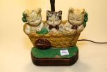 Rare Victorian kitten door stop, mounted as lamp, original paint with burlap shade Rare Victorian kitten door stop, mounted as lamp, original paint with burlap shade