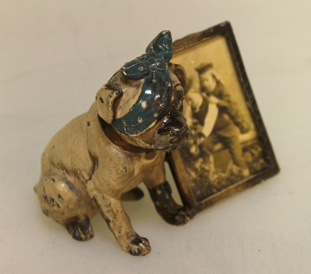 Antique painted metal bulldog with frame.; Frame, 1 7/8" w., 2 1/4" h. Antique painted metal bulldog with frame.; Frame, 1 7/8" w., 2 1/4" h.