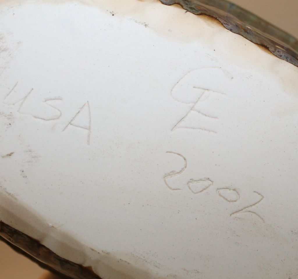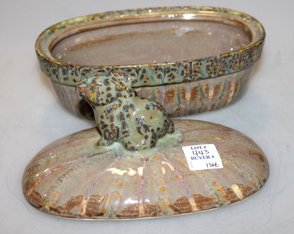 2002 Good Earth pottery covered dish with rabbit lid.; 8" w. 2002 Good Earth pottery covered dish with rabbit lid.; 8" w.