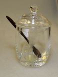 Small etched glass pitcher and etched glass condiment, missing lid.; Pitcher- 7" h.; Condiment- 3" dia. Small etched glass pitcher and etched glass condiment, missing lid.; Pitcher- 7" h.; Condiment- 3" dia.