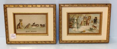 Two framed postcards of dogs and cats in appropriate gold frame.; 9" w., 7" h. Two framed postcards of dogs and cats in appropriate gold frame.; 9" w., 7" h.