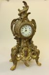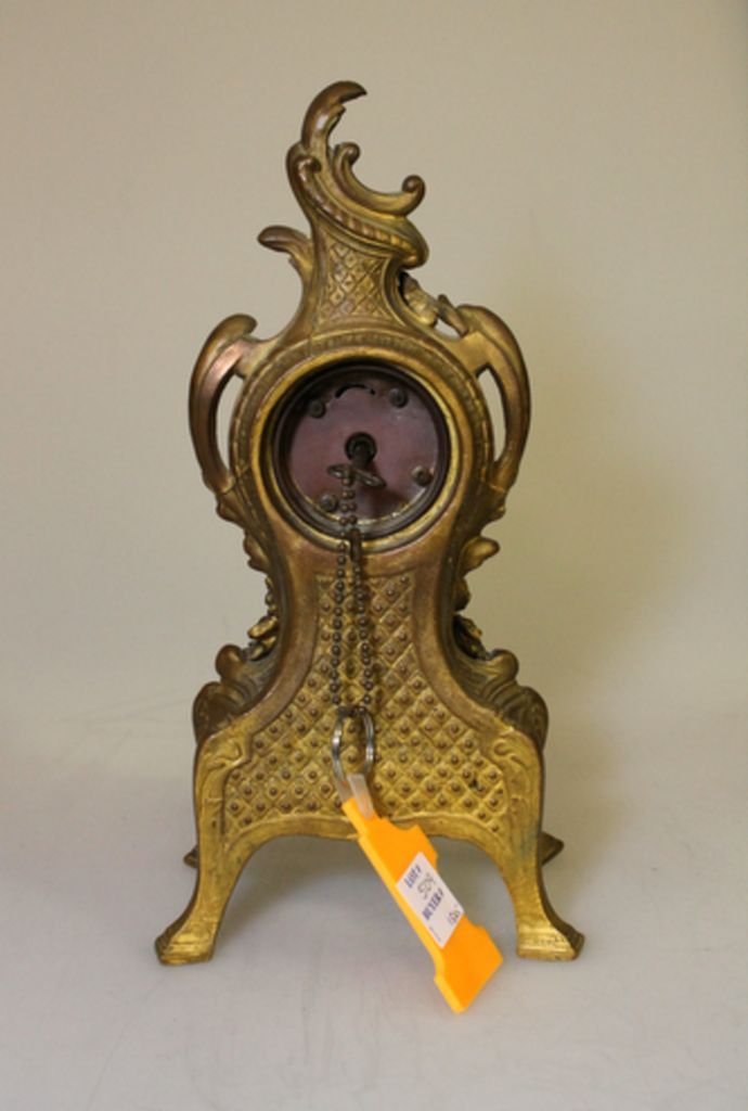 Small brass rococo style New Haven mantel clock (has key).; 12" h. Small brass rococo style New Haven mantel clock (has key).; 12" h.
