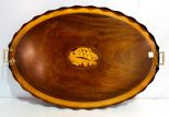 Large oval inlay tray with brass handles.; 34" w., 21 1/2" d. Large oval inlay tray with brass handles.; 34" w., 21 1/2" d.