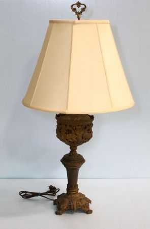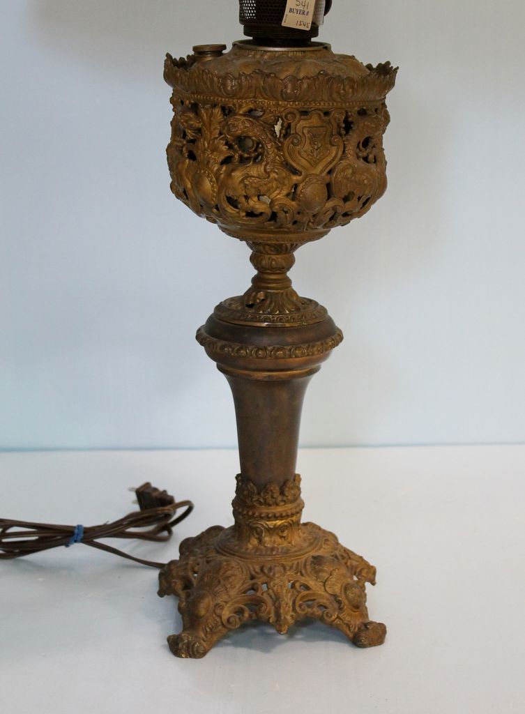 Painted gold metal Victorian oil lamp, now electrified. Painted gold metal Victorian oil lamp, now electrified.